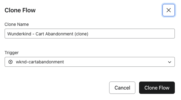 - After your Cart Abandonment flow is set up according to Wunderkind's best practices, clone it from the Flows page to quickly create additional flows for remaining Wunderkind metrics. When cloning the existing flow, Klaviyo will allow you to change the metric that triggers the new flow: