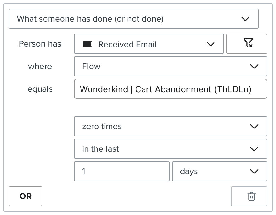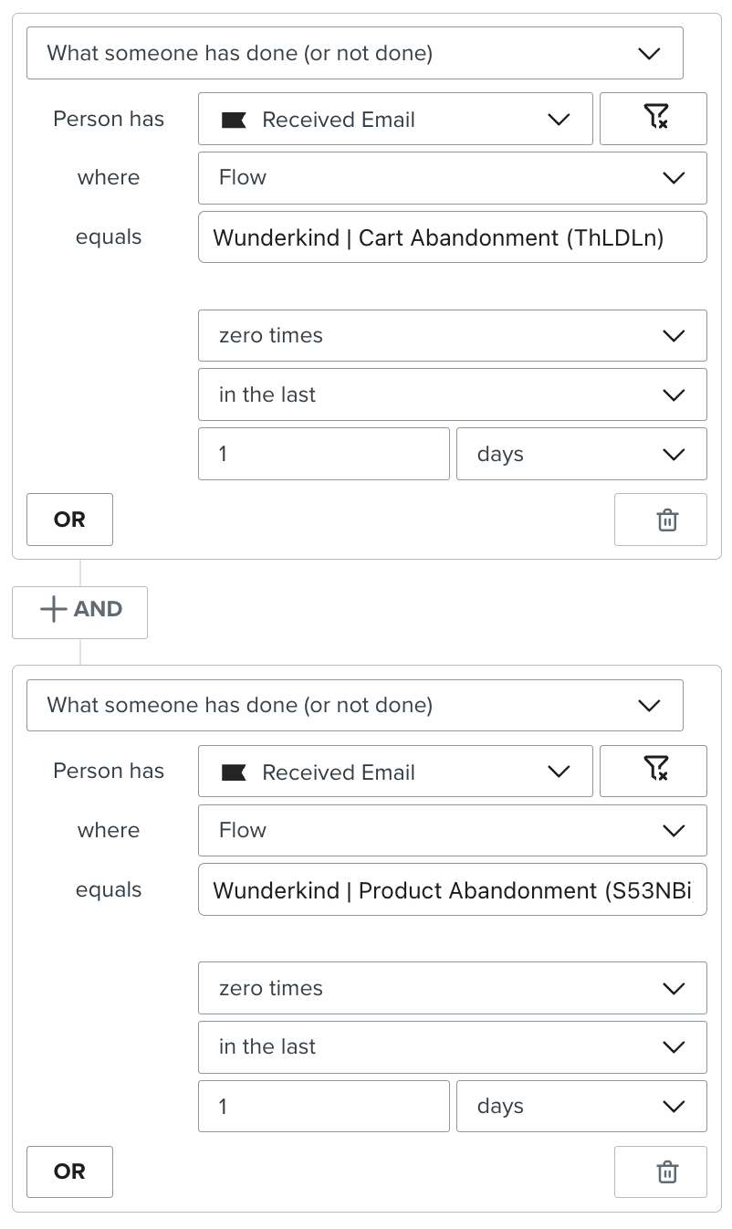 Category Abandonment: Person has received a Cart Abandonment flow zero times in the last 1 day AND person has received a Product Abandonment flow zero times in the last 1 day