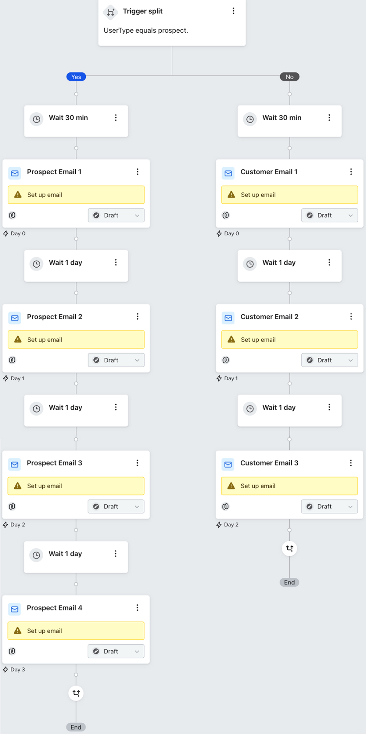 | Prospect Path (4 emails) | Customer Path (3 emails) |