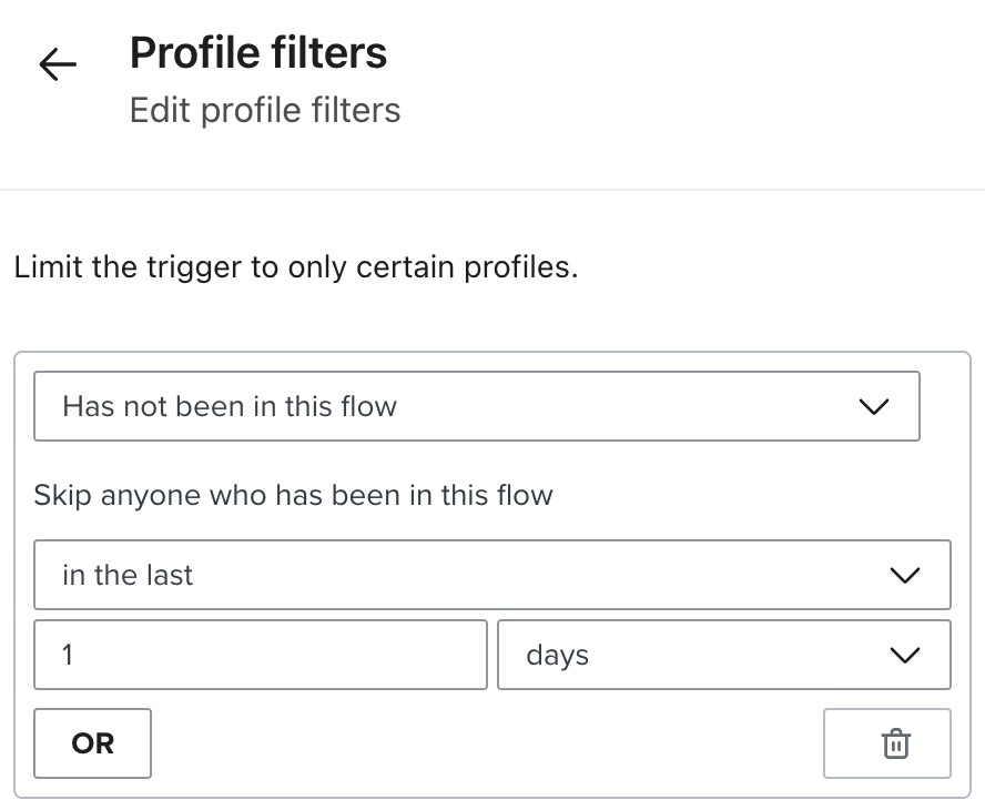 Add or edit a filter by selecting the Trigger at the top of the flow, then in the right panel, choosing Profile filter.