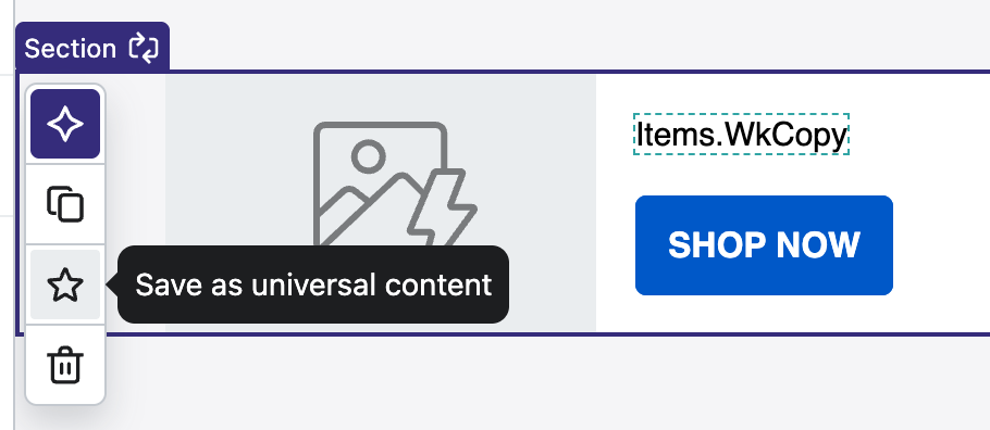 - In the Template editor, select the Section and use the star icon to save your block as Universal content.
