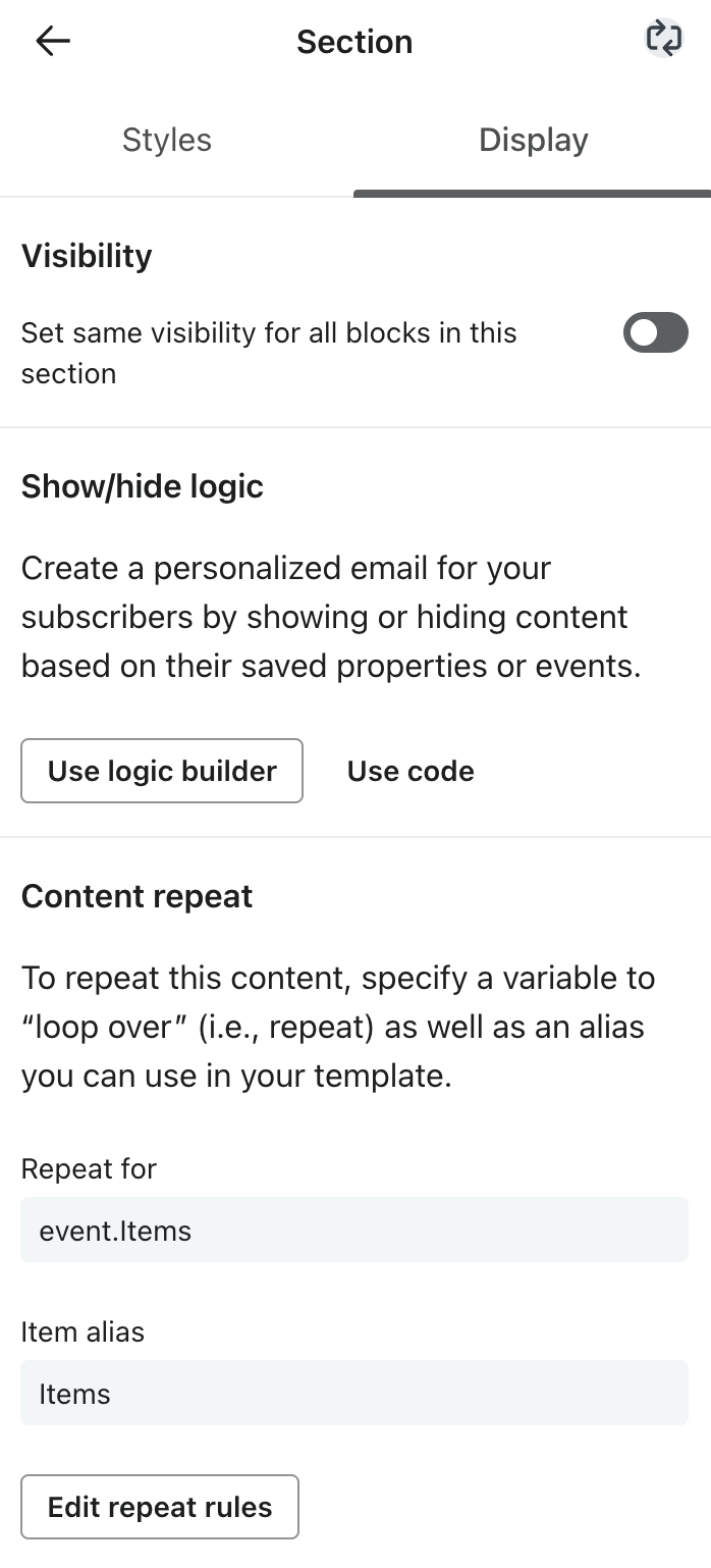 With the remaining Section selected, go the Display tab at the top of the settings panel and click Add content repeat. Here you will configure the block creative to repeat once for each product passed via the Wunderkind metric, enabling efficient iteration over all products within a single block.