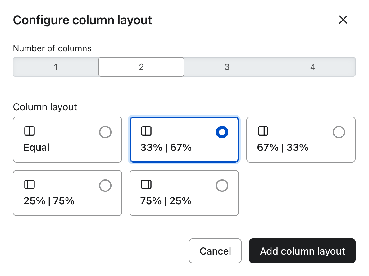 - In the Configure column layout modal, select 2 columns and split at 33%, 67%: